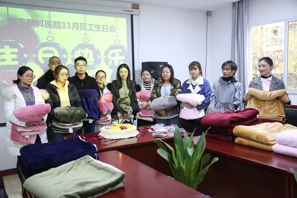 出生于11月份的员工中,既有工作在临床一线的医护人员,也有服务保障部门的管理人员。集体生日会现场精心准备了蛋糕,院领导代表全院同志向寿星们送去了美好祝福和生日礼物——小被子。
