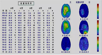 4.脑电能量分析:由处理软件对输入到计算机系统的数字脑电波形计算出各部位慢波(1.0~7.9赫芝),δ(1.0~3.9赫芝),θ(4.0~7.9赫芝),α1(8.0~9.9赫芝),α2(10.0~12.9赫芝),β(13.0~25.0赫芝)的脑电图频率指数(即在标准记录纸速时,100厘米内某一种脑波出现的厘米数,用%表示)和平均波幅等参数。