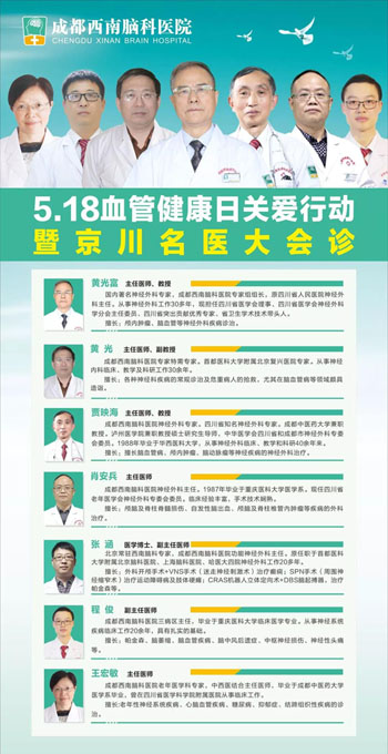 作为一家以脑科为特色的专科医院,成都西南脑科医院特举办“5·18血管健康日关爱行动”。届时,来自北京、四川的们将联合义诊,共同关注大家的血管问题!