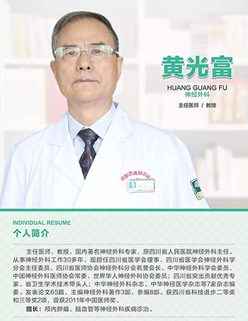医院现有医学专业人才200余人,组建了以四川省医学会神经外科学分会主任委员、国内神经外科黄光富教授、省内神经外科贾映海教授、北京常驻西南脑科张涵博士等为代表的医师团队。