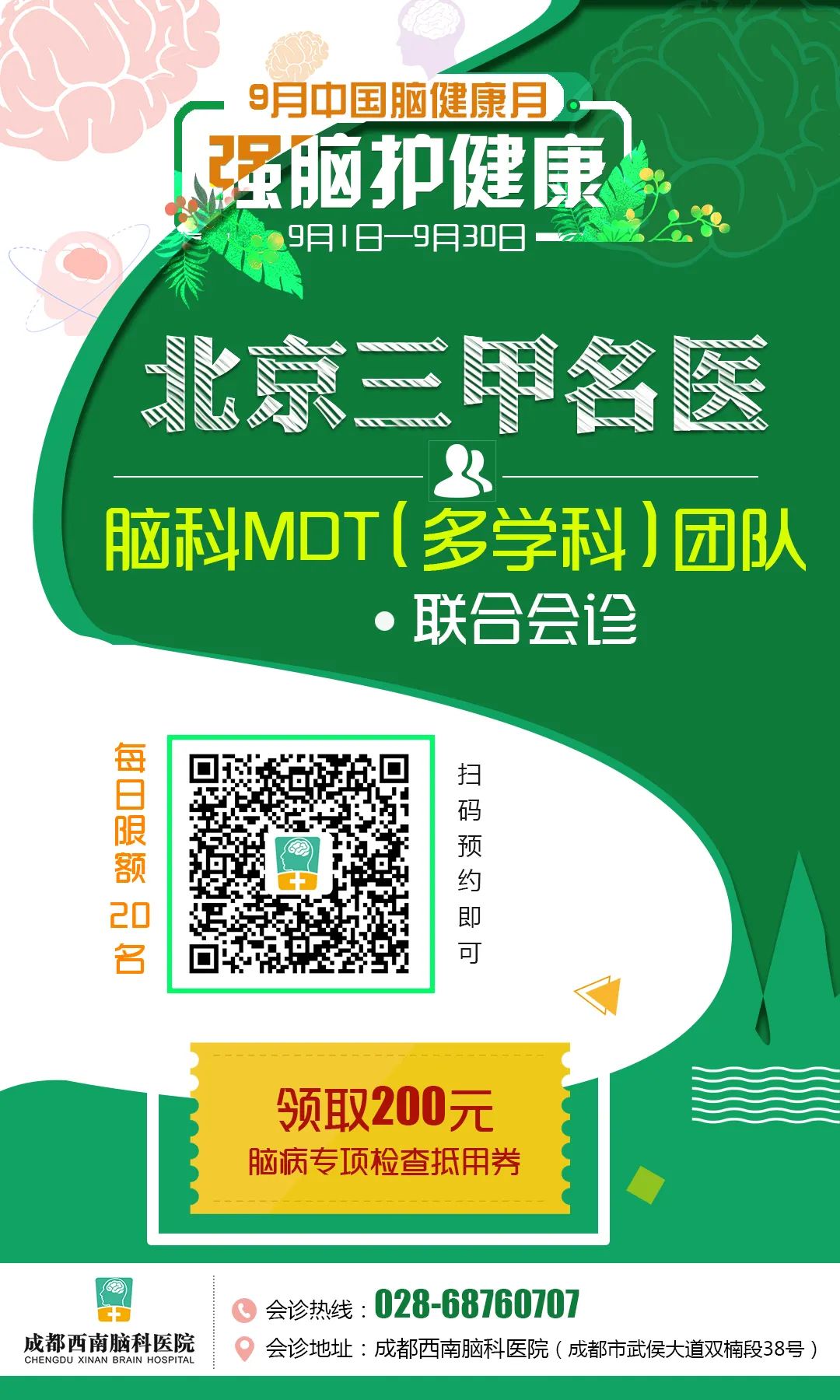 大脑是人体较重要的器官,然而现代社会生活节奏加快,人们往往忽略了大脑健康,当出现头疼、头晕、肢体不协调时,才想到去医院做脑部检查。其实,对于大部分人群来说,早期进行“脑健康”体检,可防范于未然。为此,我院将根据不同人群需求制定相关脑科筛查项目。脑健康月活动期间,到院即可领取脑病专项检查200元抵用券,仅限周末使用。