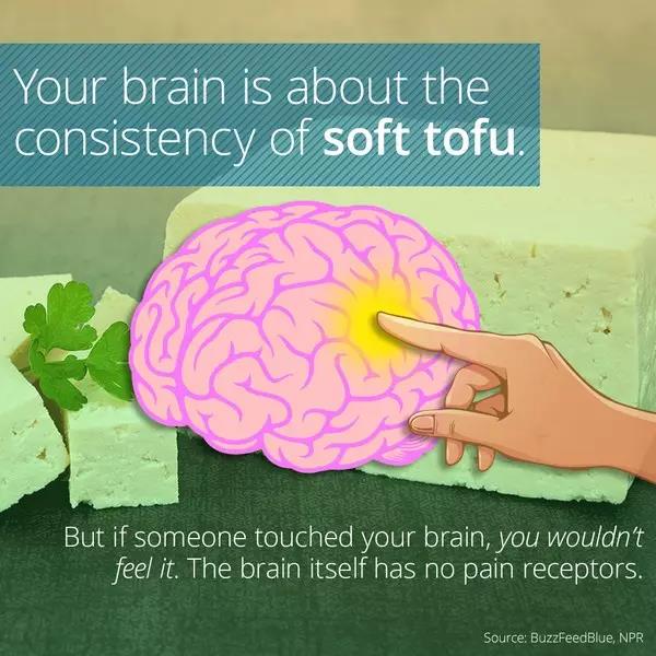 外科医生 Katrina Firlik 把大脑比作一块软豆腐,她说,即使有人能触碰你的大脑,你也会毫无察觉,因为大脑本身无法感受痛觉,只有它周围的骨骼和组织可以(小编吐槽:所以这个和豆腐有关系吗?)。当我们经历头痛时,通常是周围的组织在作怪,它们是痛苦的源泉。所以,那些经常嚷嚷脑仁疼的小伙伴们,你们都搞错位置啦!