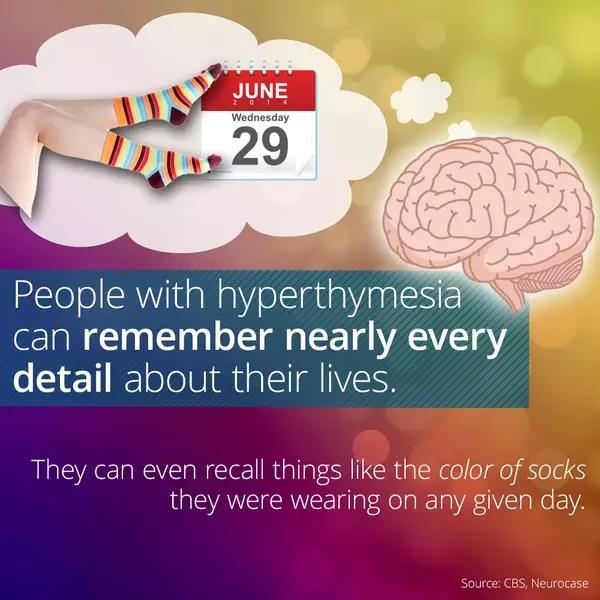 即使你自认为拥有一个好头脑,也不要妄想与超忆症(hyperthymesia)患者比记忆力。患有超忆症的人能够记住他们生活中的每一个细节,他们甚至能够记起过去任意一天中他们所穿的袜子的颜色。超忆症的英文写法 hyperthymesia源自古希腊词源“hyper”(超出的含义)和“thymesis”(记忆的含义)的组合。
