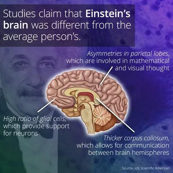 爱因斯坦去世后,科学家们把他的大脑移除、拍照、切成240块进行研究。人们发现,爱因斯坦大脑的胼胝体(大脑左右半球相连接的脑结构)比普通人厚得多,说明他的左右大脑沟通非常迅速通畅;他的顶叶是不对称的,右侧远远大于左侧,这显示他的数学与空间思维能力超群;另外爱因斯坦大脑中神经胶质细胞比例很高,这意味着神经元的营养供给十分充足。