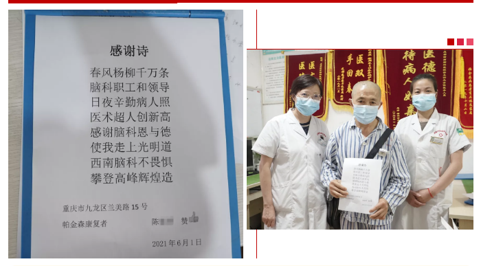 陈先生,62岁,重庆市九龙区人。2021年5月24日,因右侧肢体渐进性抖动、僵硬,伴运动迟缓5+年前来我院就诊,被诊断为“帕金森”。由于患者近半年来上述症状加重,起步转身、翻身困难,言语不清,严重影响生活质量,无法再从事体力劳动,仅靠每月微薄的退休金生活,无力承担手术费及后续的康复费用。我院经过实地考察,确定情况属实后,为患者申请了脑病救助专项基金,并为其成功实施了脑立体定向仪手术,术后经过精心护理患者已康复出院,出院前特意写了一感谢诗表示感谢。