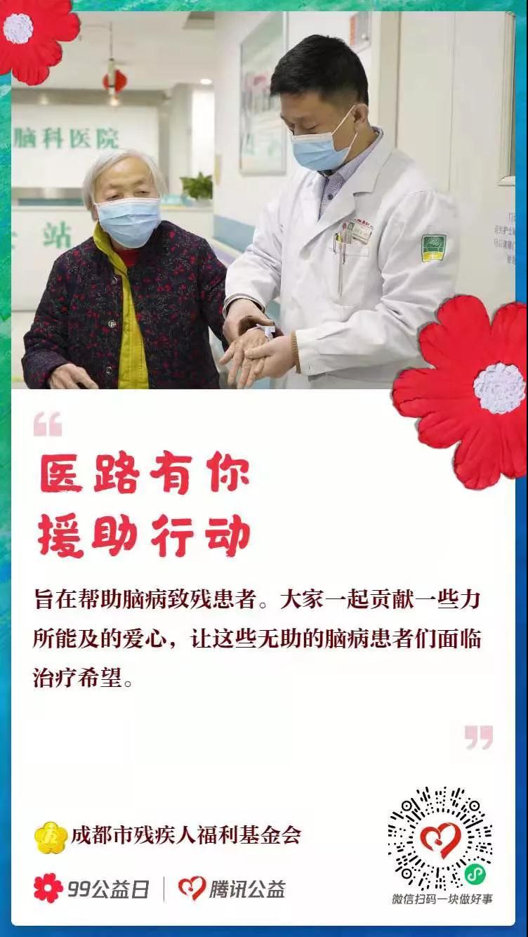 为了帮助贫困脑病患者得到及时有效的救治,重燃生的希望。在2021年第六个“中华慈善日”和《中华人民共和国慈善法》颁布实施五周年之际,在四川省残疾人联合会的号召下,成都市残疾人福利基金会联合成都西南脑科医院共同发起了“医路有你援助行动”公益项目。该项目得到了腾讯公益的大力支持,募集的善款将用于成都市内贫困脑病患者的治疗及康复救助。