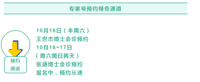 王世杰博士的会诊时间仅10月16日下午,张涵博士的会诊时间是10月16~17日两天,请大家合理的安排预约时间。