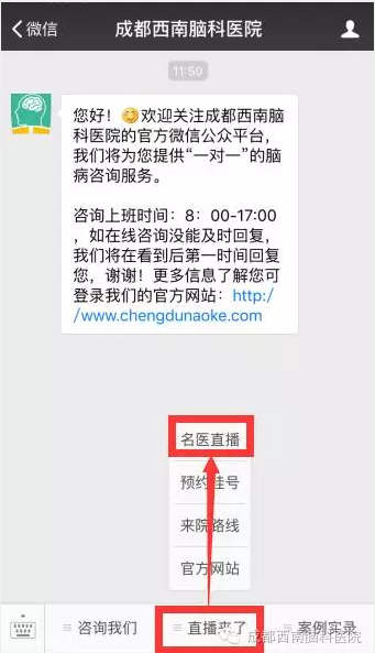 第二步:进入公众号,点击主菜单“直播来了”,选择子菜单”医生直播“即可进入《医生直播》的直播间观看直播
