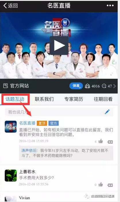 第三步:在观看直播的同时,你可以点击左侧“话题互动”菜单,输入你想要解答的问题,即可与直播医生进行互动。