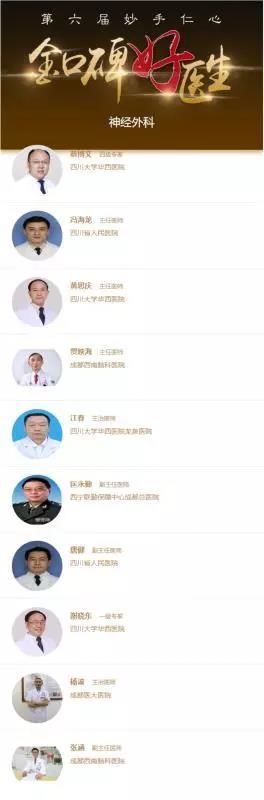 9月25日,由成都商报主办、成都商报四川医生承办、四川省预防医学会指导的 “第六届妙手仁心·金口碑好医生”评选“好医生专科专病榜十强”名单出炉!我院贾映海教授、张涵博士双双荣获“金口碑”好医生评选“神经外科十强”。