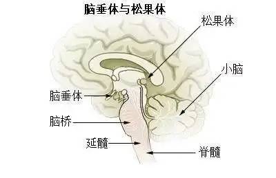 松果体位于人的脑前丘和脑丘之间,因形状类似松果而得名,主要负责分泌褪黑素。