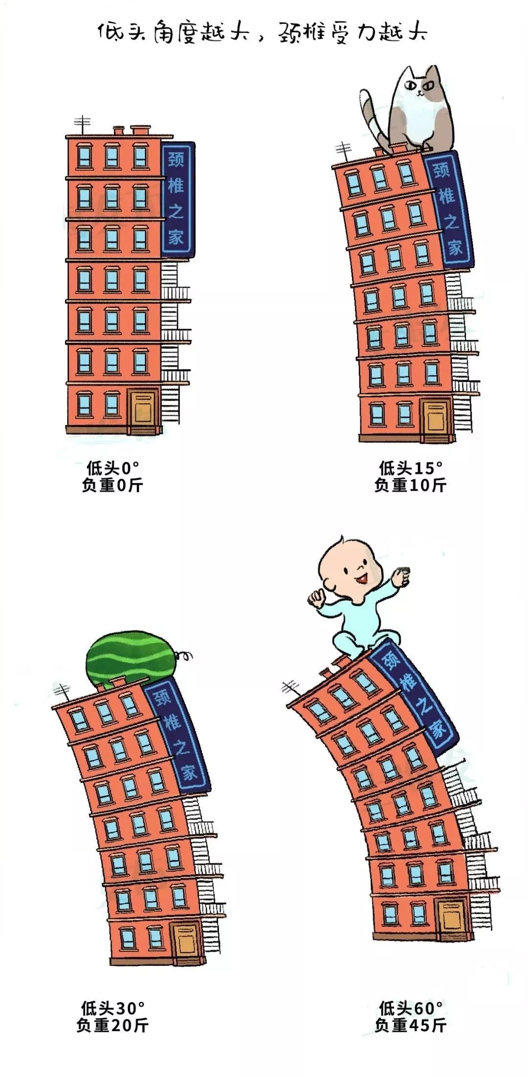 头颅的重量都需要后面的肌肉拉着,低头角度越大越久,颈椎受力就越大,肌肉连见缝插针休息的机会都找不到,它们就会未老先衰,逐渐吃不消。