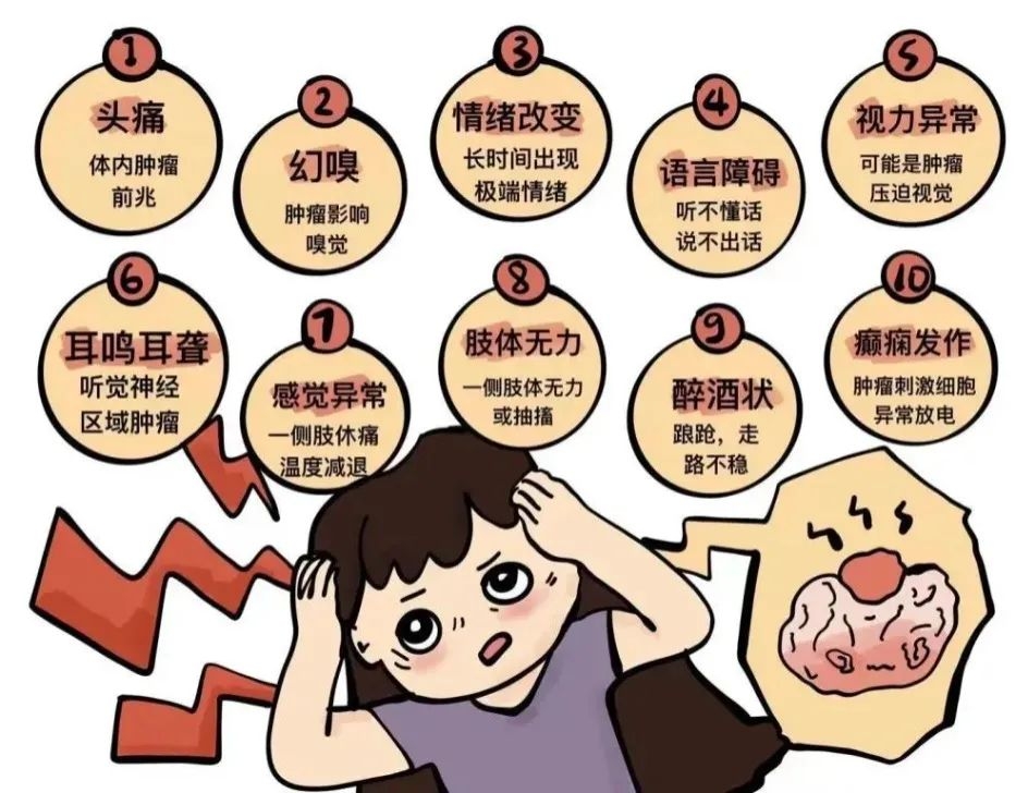 肿瘤压迫临近的脑组织,造成局部神经功能障碍,会造成言语不流利,甚至失语,也可能出现导致情绪淡漠和记忆力下降的现象。