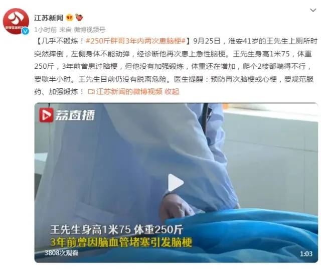 数据显示,我国每年死于脑梗的患者有120万,也就是说,每21秒就有1人死于脑梗。最近就有一则250斤胖哥3年内两次患脑梗的新闻,引发网友广泛讨论,一起来看看。