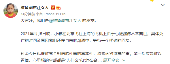 2021年1月5日晚,小雅在北京飞往上海的飞机上由于心脏骤停不幸离世。具体死亡的时间及原因我们还在与东航沟通中,等待一个明确的回复。