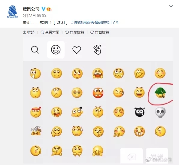 近日,腾讯公司通过其官方微博宣布微信表情戒烟了。据人民日报消息,早在2017年9月,北京市控烟协会就曾建议腾讯公司采取措施,将微信、QQ上的“吸烟表情”尽快撤除。