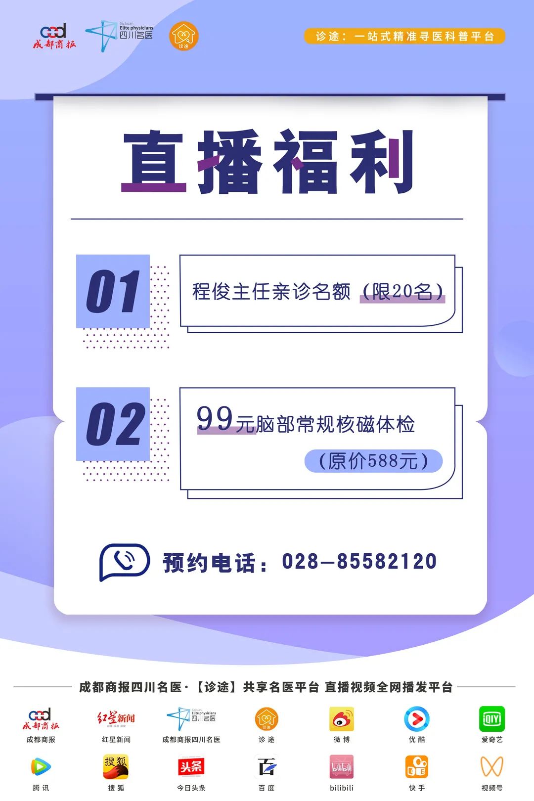 更多脑中风相关知识,尽在今晚(6月23日)19:00,程俊主任受邀做客成都商报·四川医生栏目《诊途·好医生在线》直播间,教你战胜脑中风。