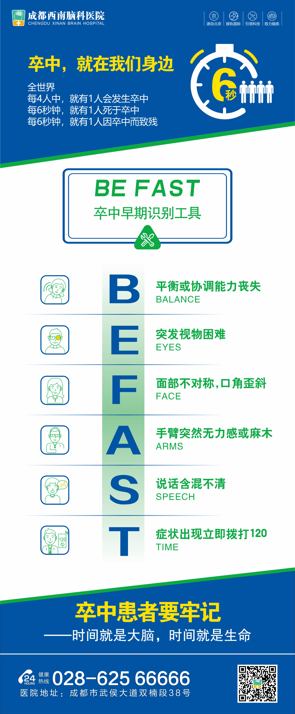 想要第一时间判断身边的人是否中风,一定要记住由中国卒中学会在去年7月的第七次学术年会上正式发布的“BE FAST”口诀。时间就是大脑,这个短语本身就是“快速、加急”的意思,拆分开来的每个字母也都代表一个需要关注的方面: