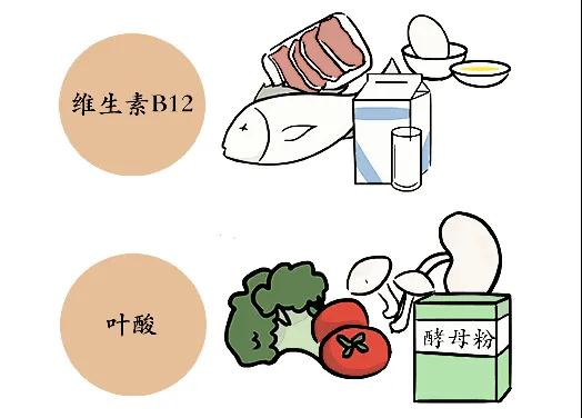人体所需的维生素B12主要从肉、鱼、蛋和一些乳制品中摄取,叶酸则主要通过新鲜绿叶蔬菜、肝、肾、酵母和蘑菇等摄取。