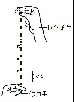 一个人拿着尺子,垂直,零刻度朝下,突然松手,另一个人去抓尺子,如果抓住的刻度在5厘米左右,说明反应比较快;超过20厘米则反应比较迟钝。