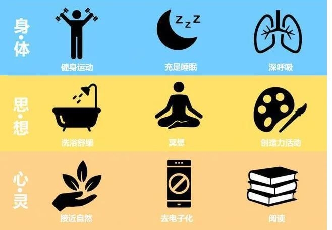 呼吸法:借助深而长的呼气与吸气,达到放松效果,以腹式呼吸为佳;