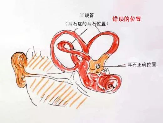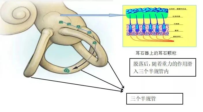 当我们改变头部姿势时,耳石因重力作用在半规管内的淋巴液里滚动,产生加速度,就会导致眩晕、眼震的症状。